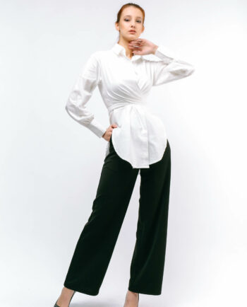 Bir çiyni açıq, uzun qollu, biləkdə bağlanan, önü düyməli qısa köynək. Rəng: Ağ. Parça: Köynəklik. Maniken: Bədən 36, Boy 177sm. Yuyulma qaydası: 30 dərəcədə tərs üzdən yuyulmalı və ütülənməli.