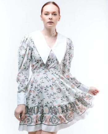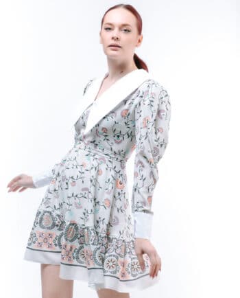 Çiçəkli, bogazdan iplə bağlanan, öndə yırtmacı olan uzun libas. Parça: Şifon. Maniken: Bədən 38, Boy 170 sm. Yuyulma qaydası: 30 dərəcədə tərs üzdən yuyulmalı və ütülənməli.