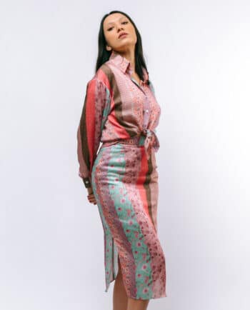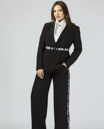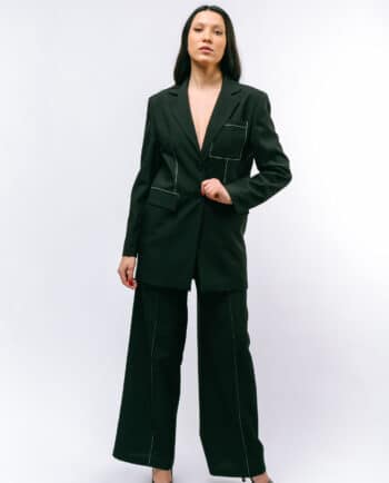 Düz, aşağısı qatlı ətək və beldən ipli kəmər və cibli pencək. Parça: Yun. Manken: Bədən 36, boy 180sm. Yuyulma qaydası: 30 dərəcədə tərs üzdən yuyulmalı və ütlənməli.