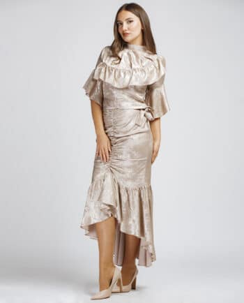 Boz çəhrayı zərli, korset ətək və pencək dəsti. Parça: Chanel. Maniken: Bədən 36, Boy 177sm. Yuyulma qaydası: 30 dərəcədə tərs üzdən yuyulmalı və ütülənməli.