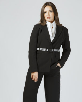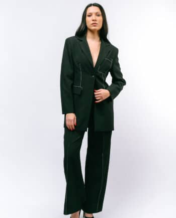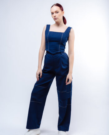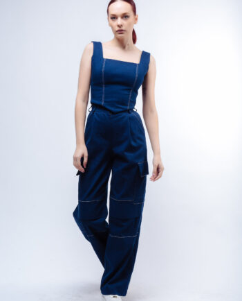 Yüksək bel, iki düyməli, enli şalvar və çiyinləri açıq enli korsetdən ibarət dəst. Rəng: Qara. Model: 38 bədən, Boy 170 sm. Yuyulma qaydası: 30 dərəcədə yuyulmalı və ütülənməli.