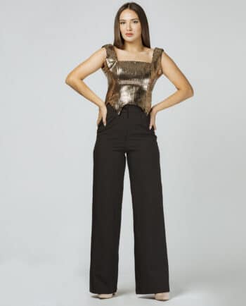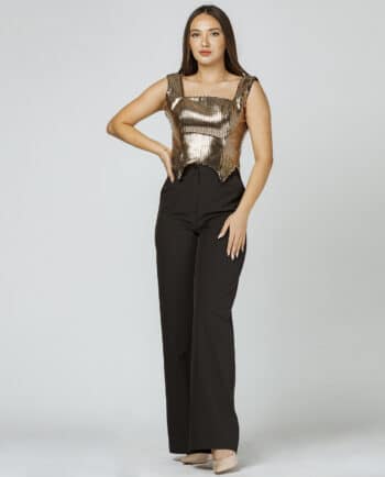 Tək çiyinli, yandan bağlamalı kğynək və uzun, yandan büzməli ətəkdən ibarət dəst. Model: Bədən 38, Boy 170 sm. Yuyulma qaydası: 30 dərəcədə tərs üzdən yuyulmalı və ütülənməli.