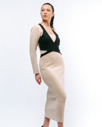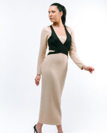 Önü büzməli, uzun qollu, qısa yırtmaclı uzun libas. Rəng: Açıq mavi gümüşü qarışıq. Parça: Azimut. Maniken: Bədən 38, Boy 170sm. Yuyulma qaydası: 30 dərəcədə tərs üzdən yuyulmalı və ütülənməli.