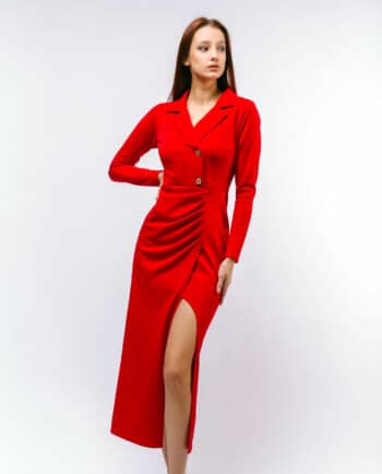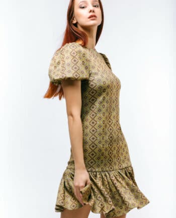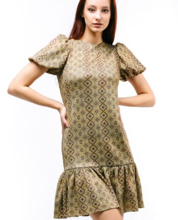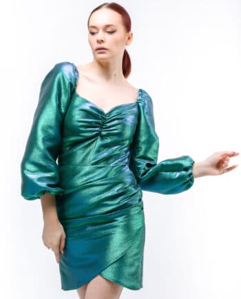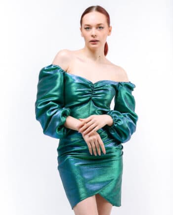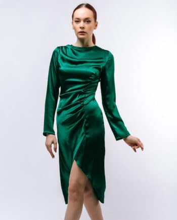Qolları uzun, ətəyi volanlı, yandan büzməli, uzun libas. Rəng: Su yaşılı. Parça: Şahnazı ipək. Maniken: Bədən 38, Boy 170sm. Yuyulma qaydası : 30 dərəcədə tərs üzdən yuyulmalı və ütülənməli.