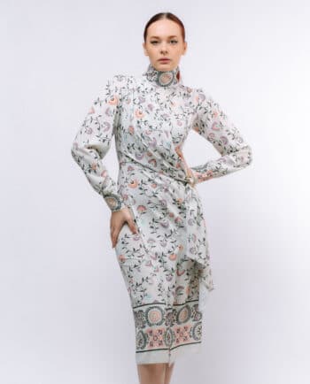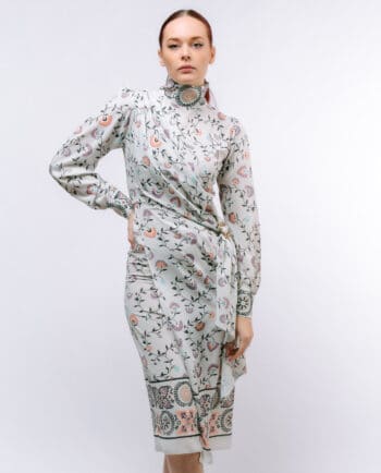 Yaşıl zolaqlı, qolları enli, öncən yırtmaclı uzun libas. Material: Kətan. Model: Bədən 36, boy 165sm. Yuyulma qaydası: 30 dərəcədə tərs üzdən yuyulmalı və ütülənməlidir.